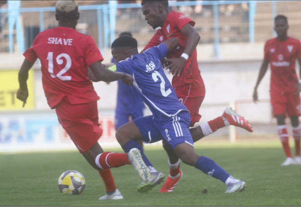 Dynamos captain Emmanuel Jalai, centre battles for the ball with Triangle defenders during yesterday’s nil-all draw at Rufaro Stadium. PIC: BRIGHTON GOKO.