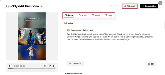 When your intro loads, use Quick edit to perfect elements such as caption styling, script tone, voiceover character, or avatar. Want more creative control? Use Edit more to launch the full editor. Combine this intro with your full video, transition and make sure the aspect ratio is locked in at 16:9 for YouTube. This step is where beginners start to feel like directors.