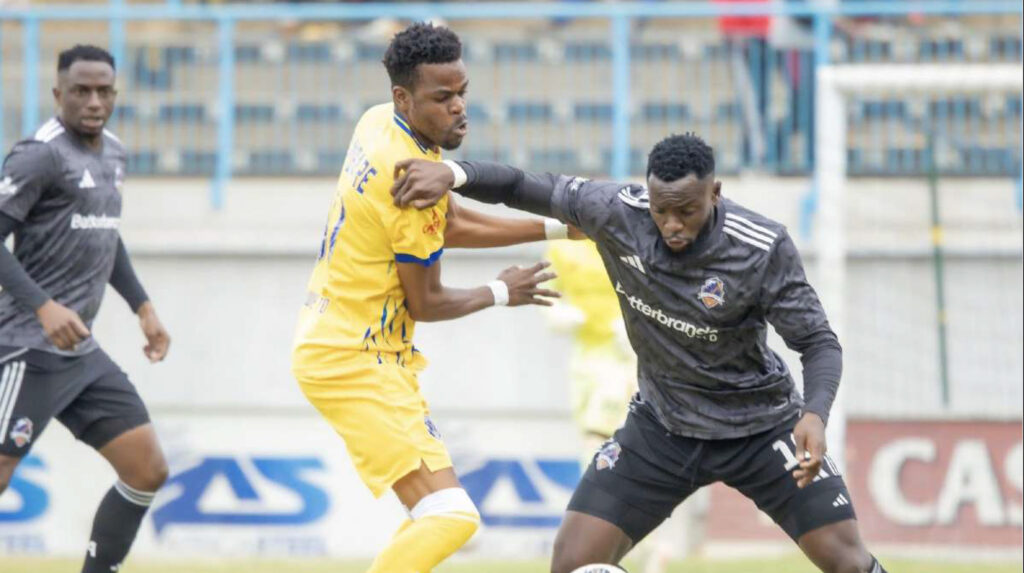Scottland’s Albert Manenji, right, tussles for possession wtih Kwekwe United’s Masimba Mambare at Rufaro Stadium yesterday